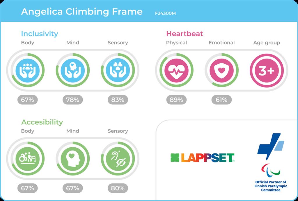 Angelica ronimisraam ühendab elegantse disaini ja mängulise väljakutse oma ümaras vormis ja hästi ligipääsetavates ronimiselementides. Lapsed alates 3. eluaastast saavad ronida, roomata ja avastada mitmest erinevast suunast, mis soodustab kujutlusmängu, sotsiaalset suhtlust ja motoorsete oskuste arengut. Selle avatud struktuur toetab kaasavat mängu ja rühmasuhtlust, muutes selle suurepäraseks valikuks koolihoovidesse, parkidesse ja avalikesse mängualadesse.