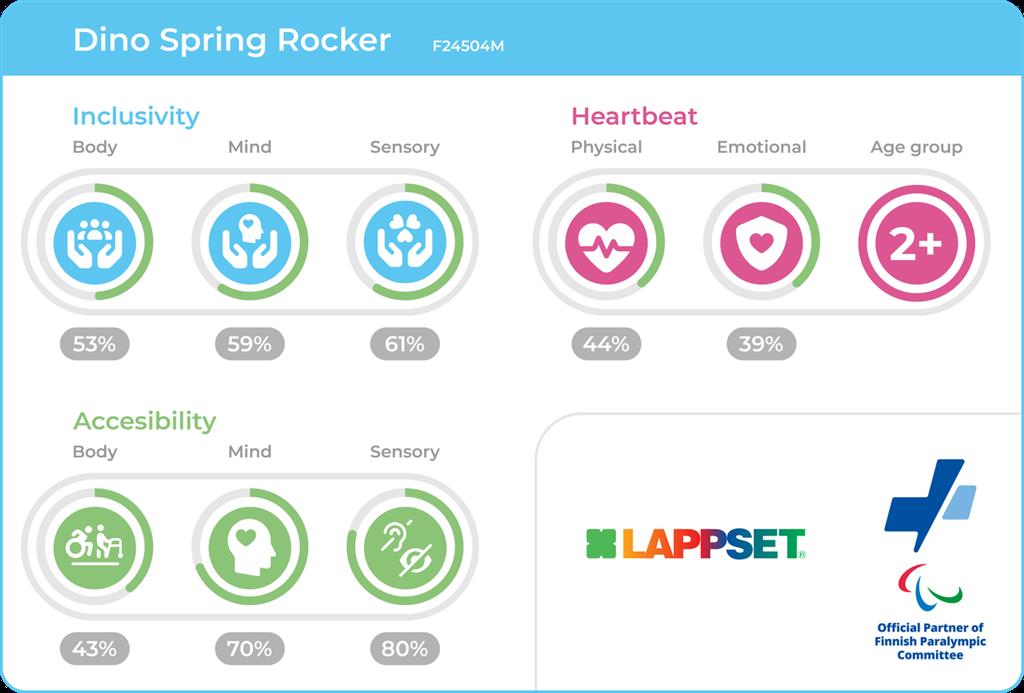 Dino vedrukiik ärkab ellu energiast ja kujutlusvõimest, kutsudes lapsi (alates 2. eluaastast) osalema temaatilises liikumismängus. Õõtsudes arendavad lapsed lihasjõudu, tasakaalu ja ruumitunnetust, samal ajal tegeledes jutustamise ja rollimänguga. Vastupidav konstruktsioon tagab turvalise kasutuse intensiivsetes keskkondades, nagu avalikud pargid, koolihoovid ja lasteaedade mängualad. Dino kaasahaarav kuju muudab kiigu loomulikuks keskpunktiks, mis kohe tähelepanu köidab ja mängulusti sütitab.