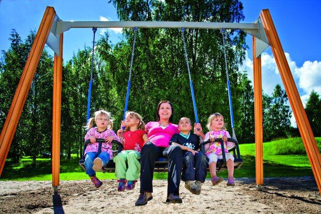 Fantastiline kiik, kus saab korraga istuda ja kiikuda kuni 5 inimest - 3 kohta keskmisel raamil ja külgedel 2 väikest last lasteistmetel.